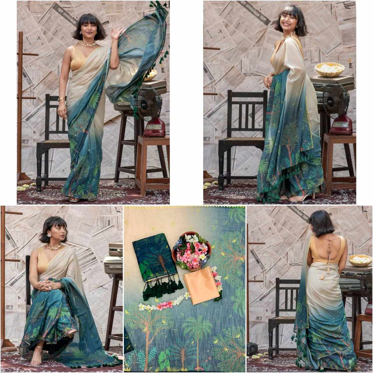Saree Fabric: Soft Linen Cotton with beautiful digital print and elegant handmade cotton tassels